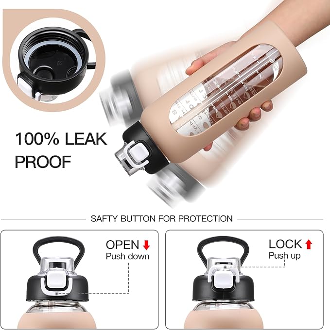 - 【Multifunctional Humanized Design】The 32 oz glass water bottle featured with latest pop up lid with premium safety lock, 100% leak-proof, and can be easily opened with one hand.The large glass bottles have two ways to drink water by a straw and a hole after remove the straw that can be drink from directly , which is very convenient and fast.