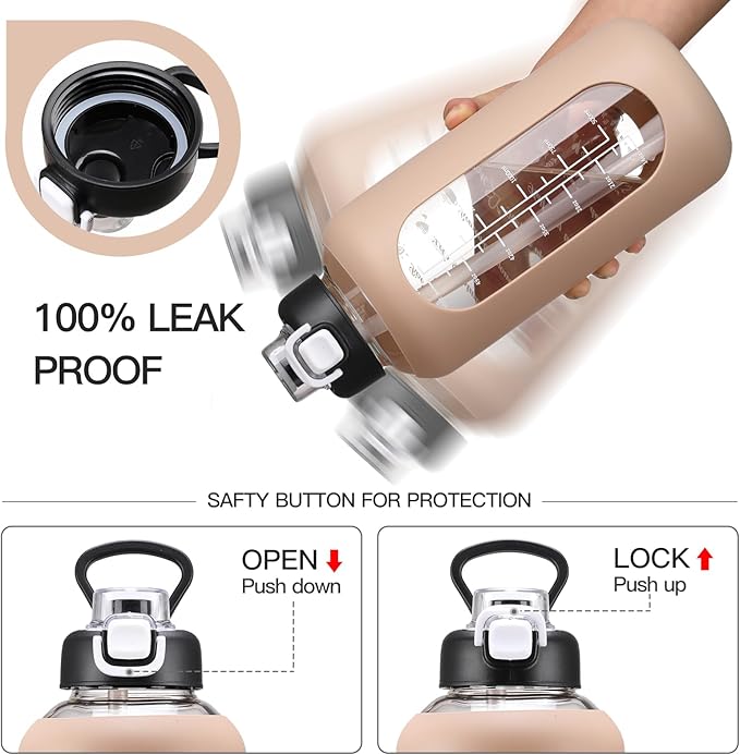 - 【Multifunctional Humanized Design】The 64 oz glass water bottle featured with latest pop up lid with premium safety lock, 100% leak-proof, and can be easily opened with one hand.The large glass bottles have two ways to drink water by a straw and a hole after remove the straw that can be drink from directly , which is very convenient and fast.