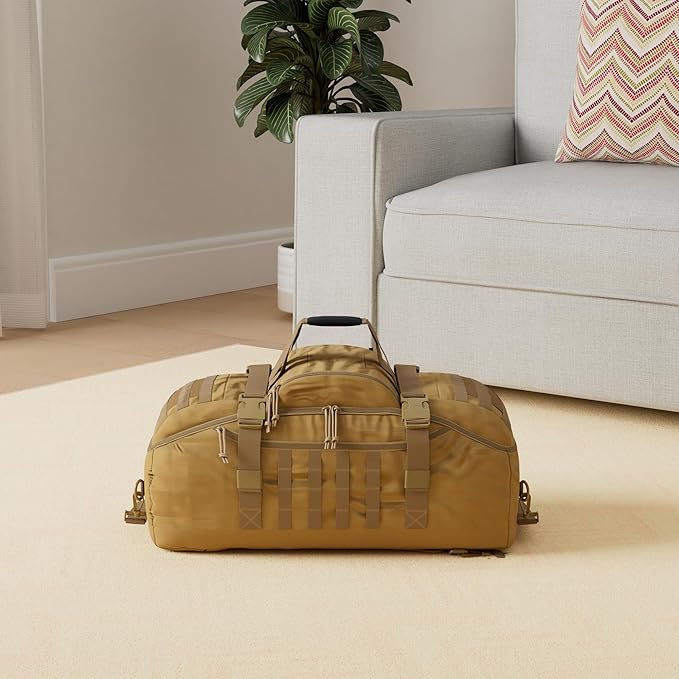 - 【MOLLE System for Tactical Duffle Bag】Put a 3”×6” patch panels at the front and back to stick your name patches and morale patches,Heavyweight MOLLE loops and webbing for the modular attachments. Molle webbing throughout for attaching additional tactical pouches or all the gear you need.