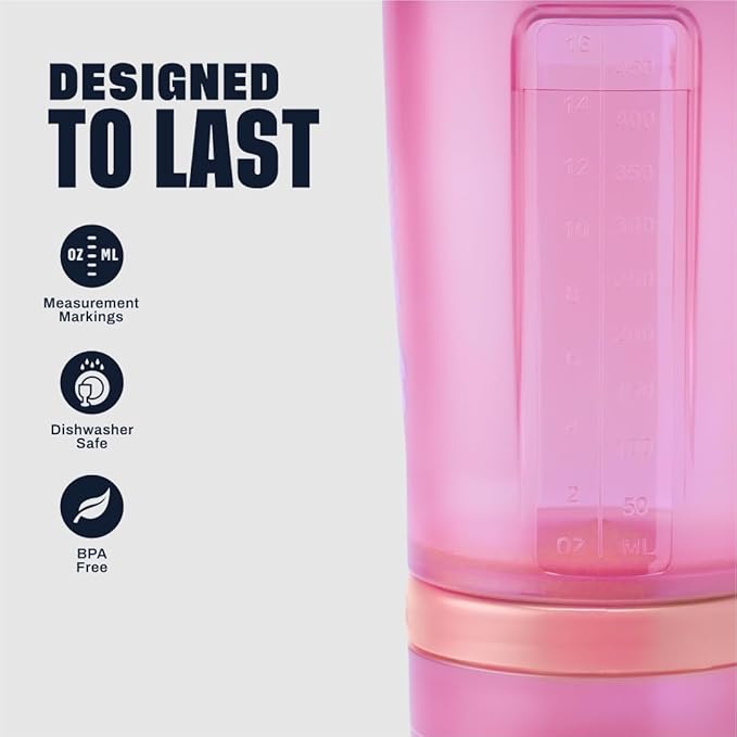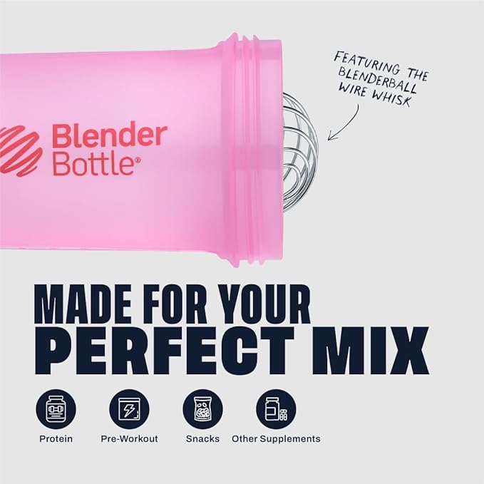 - Includes 22-oz. capacity BlenderBottle shaker (markings to 16 oz.), 150 cc jar, 100 cc jar, pill organizer, and patented BlenderBall whisk