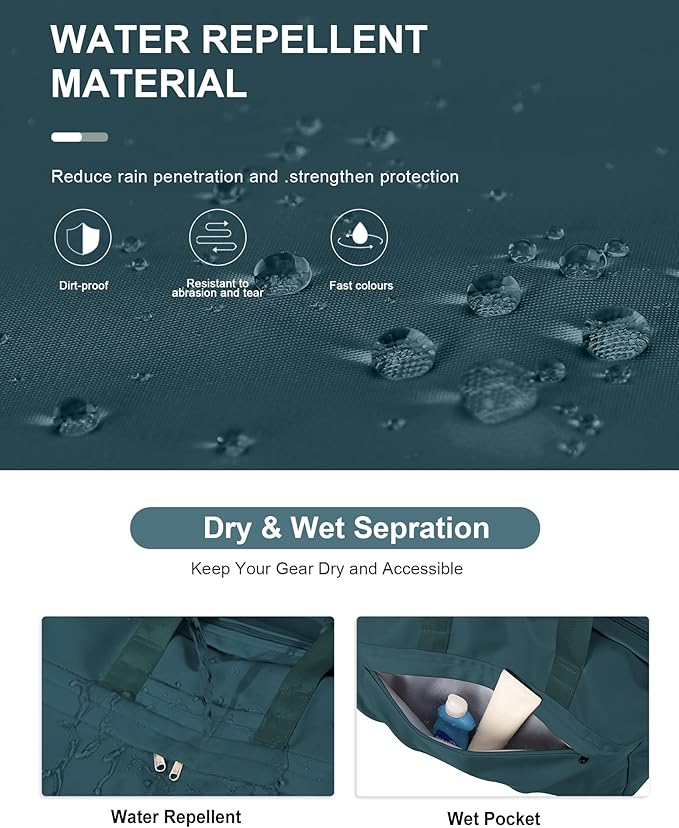- 【Waterproof & Dry Wet Pocket】The bag is made from high-density waterproof material to repel water and keep the contents inside dry. The bag has a compartment designed specifically for separating dry items from wet ones like wet clothes or towels