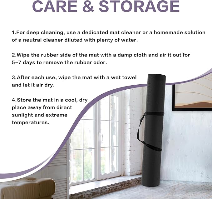 - CARE INSTRUCTION - 1. All natural rubber possesses a harmless rubber aroma. Wipe the rubber side with a damp cloth and place it in a well-ventilated area for 5-7 days, allowing the scent to gradually fade. 2. Store the yoga mat in a cool, dry place away from direct sunlight and extreme temperatures.