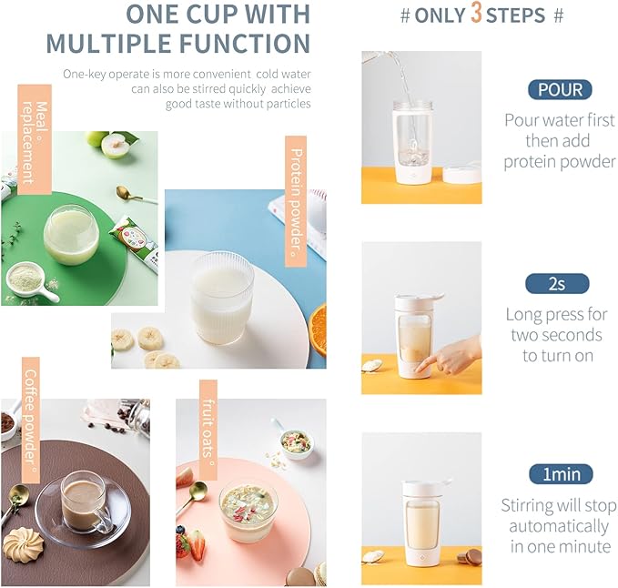 - RECHARGEABLE & POWERFUL-MOTOR - Simply connect the cup to any USB port with the included USB cable, no batteries required, save you money. Our electric shaker bottle mix the protein powder evenly with strong motor power which spins at 7000rpm, ensuring smooth mixing with no lumpiness.