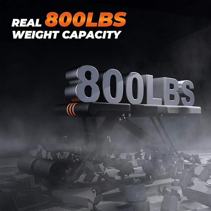 - 【Heavy Duty Commercial Steel Frame】This adjustable weight bench made of commercial grade square steel frame and 1.6mm thickened tube wall is much more stable and can withstand high intensity workouts, making the weightlifting bench has a real 800lb weight capacity, giving you a safe fitness experience without worrying about instability.