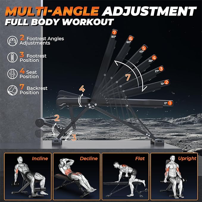 - 【Adjustable & Foldable Weight Bench】Designed with 7 backrest adjustments,4 Seat adjustments,3 footrest adjustments and 2 footrest angles adjustments, this adjustable weight bench offers penple a full-body workout to strengthen and tone all of your muscle groups to meet your fitness goals with ease. Foldable design makes you can store quickly under beds or in closets to save the space.