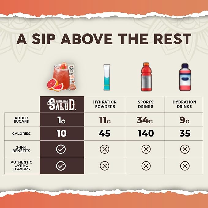 - US vs THEM - Unlike other sports drinks and hydration multipliers that are loaded with sugars and artificial dyes, Salud will turn plain water into a mouth-watering Agua Fresca drink with only 1g of added sugar and 10 calories per serving. So delicious you might forget each serving is packed full of powerful benefits!