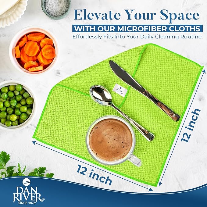 DAN RIVER 12-Pack Green Microfiber Towels โ Ultra Absorbent, Lint-Free & Streak-Free Terry Cloth Rags for Home, Car & Kitchen - Must-Have Cleaning Essentials - 12" x 12"