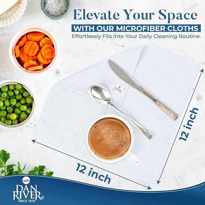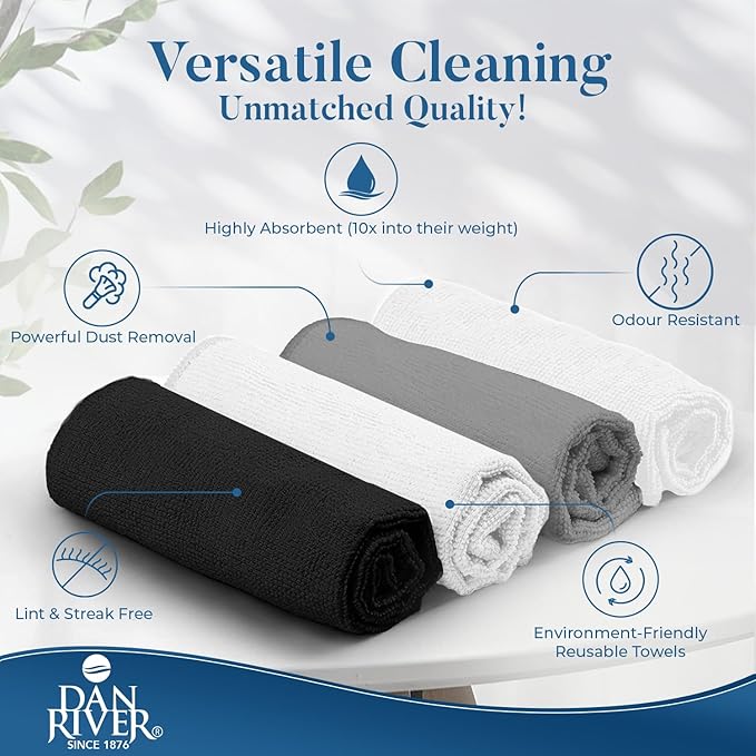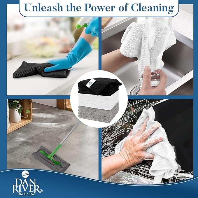 DAN RIVER 12-Pack Microfiber Towels โ Ultra Absorbent, Lint-Free & Streak-Free Detailing Towels for Home, Car & Kitchen - Must-Have Cleaning Essentials - 12" x 12" - Gray White Black