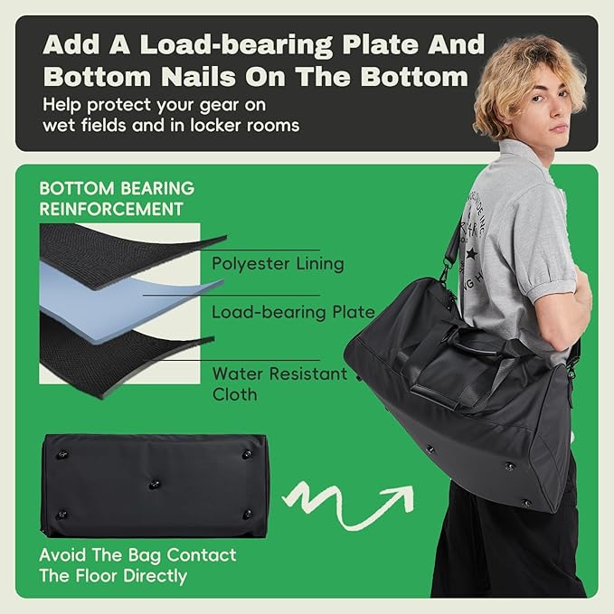 - [Excellent Bearing Capacity] The shoulder pad has a load-reducing design, and it still feels relaxed when using it with a load. There are 5 feet at the bottom of the bag, which ensures that the bottom of the travel bag does not touch the ground while increasing the load-bearing capacity of the duffel bag, which is very suitable for outdoor use