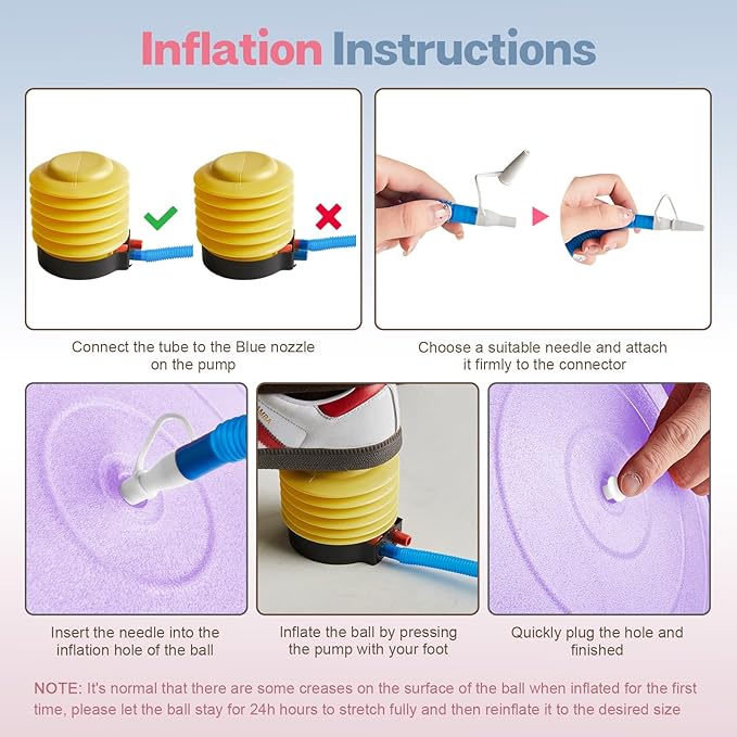 - ππ π πππππππ πππ ππππππ- As the exercise ball for workout is delivered deflated, you are provided with a foot pump to expedite the inflation process and make it more effortless. INFLATION INSTRUCTIONS: (It may be necessary to re-inflate your new Yoga Ball after initial inflation to allow the ballβ s material to fully stretch to its desired size. Let the ball sit for 24 hours after the initial inflation, then inflate it again to make it full.)