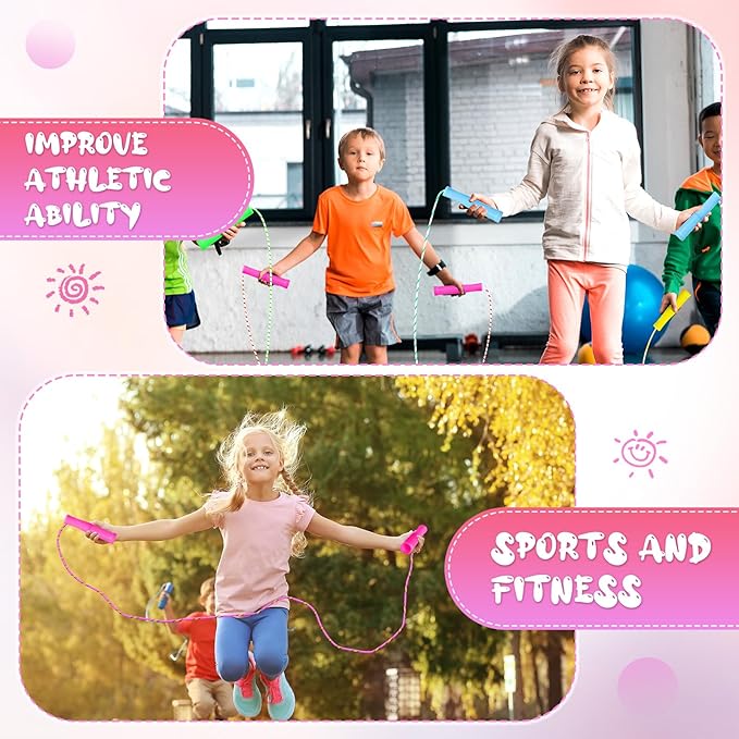 - Anti Slip Grip: featuring a plastic handle with an anti slip grip and a soft yet durable cotton rope, our kid jump rope ensures your child's safety and comfort during their activity; They are sturdy, won't deform easily, and are suitable for kids aged 3 and above; Ideal sports equipment for children nurturing their physical development