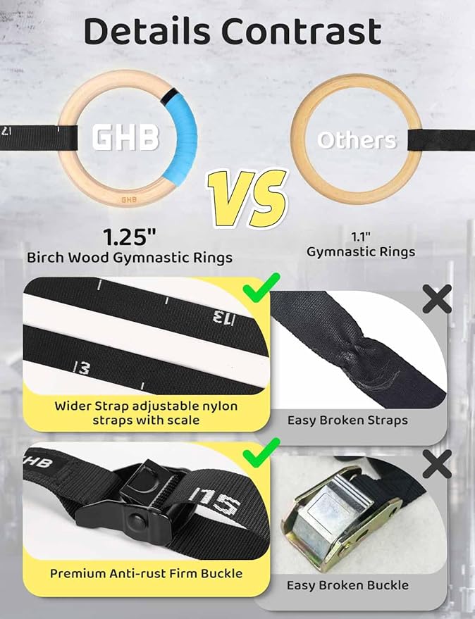 - (Ultra-high Load-bearing Performance 1.25" Olympic Rings) The exercises gymnastic rings are made of birch wooden 1.25",which is wide for comfortable grip,better than previous 1.1".GHB pull up rings have great load-bearing capacity and stronger