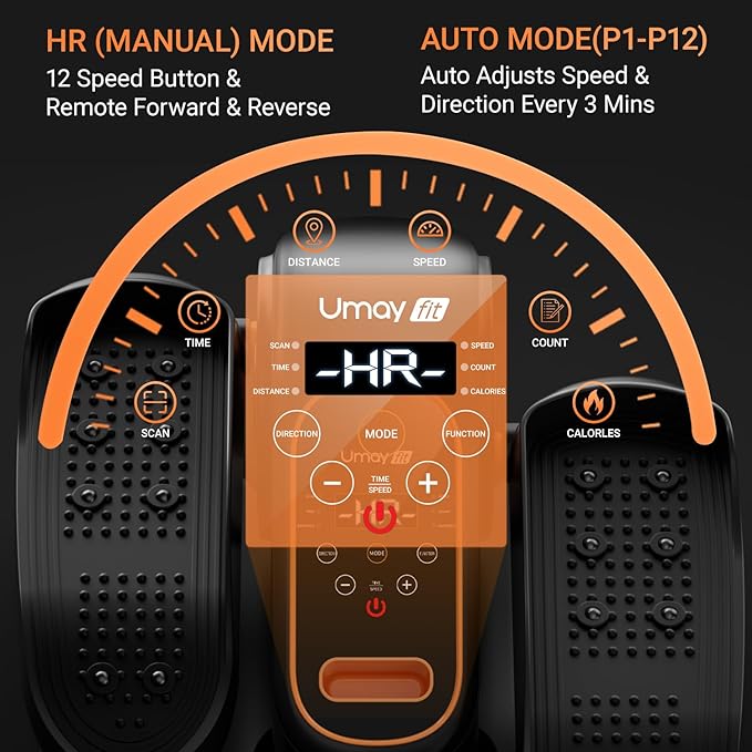 - Auto & Manual Modes: UMAY elliptical provides Auto & Manual Modes for you, elderly people can choose 1-4 levels of low speed for leg exercise and relaxation. In Manual mode, you can set workout time of 15-30min, 12 speeds and forward&backward direction by remote control or button of the elliptical machine. The speed and direction have been programmed in Auto mode, you can adjust P1-P12 mode by press mode button, the speed changes every minute and the direction changes every 3 minutes