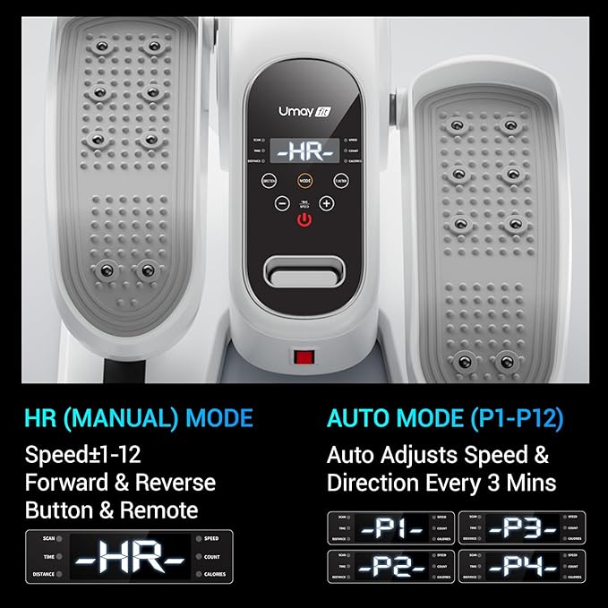 - Auto & Manual Modes: UMAY elliptical provides Auto & Manual Modes for you, elderly people can choose 1-4 levels of low speed for leg exercise and relaxation. In Manual mode, you can set workout time of 15-30min, 12 speeds and forward&backward direction by remote control or button of the elliptical machine. The speed and direction have been programmed in Auto mode, you can adjust P1-P12 mode by press mode button, the speed changes every minute and the direction changes every 3 minutes