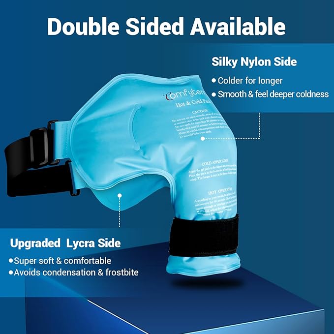 - HUMANIZED DUAL-FABRIC DESIGN: The Comfytemp shoulder wrap around ice pack is designed with dual fabric to provide various level of coldness for targeted cold therapy. The upgraded skin-friendly soft lycra side delivers soothing cold and prevents frostbite, can be applied directly without extra wrapping. The silky nylon side penetrates intense cold to the injured shoulder. Start with the lycra side for adaption, then flip over to the nylon side for intensive & long-lasting relief and relaxation.