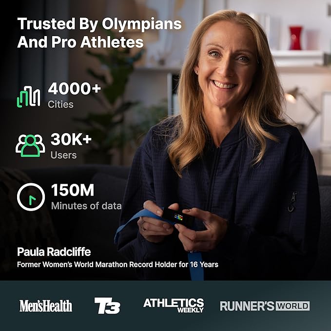 - BLUETOOTH WEARABLE WITH APP/DEVICE COMPATIBILITY: Pairs via Bluetooth 5.0 (3× faster) to most fitness devices and phones. Works with iOS/Android apps, Apple Watch, Garmin, Peloton, Zwift, and more. Stream and review data live or later for in-depth training feedback.