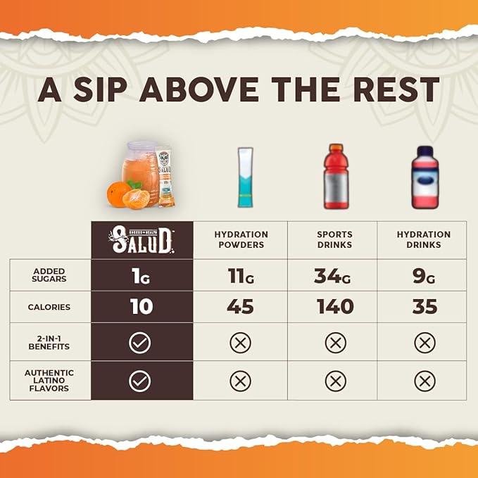 - US vs THEM - Unlike other sports drinks and hydration multipliers that are loaded with sugars and artificial dyes, Salud will turn plain water into a mouth-watering Agua Fresca drink with only 1g of added sugar and 10 calories per serving. So delicious you might forget each serving is packed full of powerful benefits!
