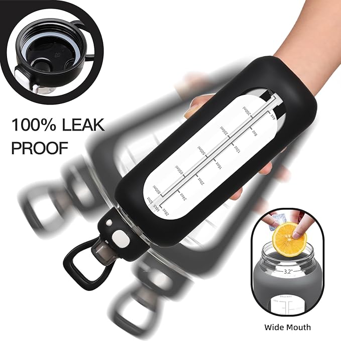 - WATER BOTTLE with TIME MAKER: With a generous 32-40oz capacity, our glass water bottle is big and tall and perfect for staying hydrated throughout the day.The water bottle also features convenient time markings allowing you to track your water intake and maintain a healthy hydration routine.You can also use it to monitor the daily water intake of parents and children