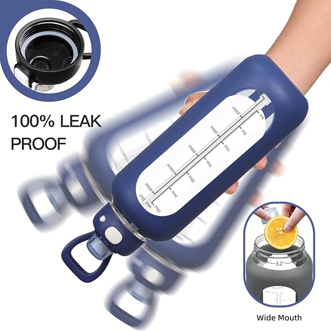 - NEW & IMPROVED DESIGN - We listened and worked hard on making this version the best glass water bottle! This version 2.0 is made of strong borosilicate glass and offers a thick glass bottom for added durability.The new stylish extra-thick silicone sleeve features ribbed sides for added protection and an extra comfortable, non-slip grip. Our glass water bottles are leakproof, reusable, and an excellent gift for wellness-oriented individuals and fitness enthusiasts of all genders