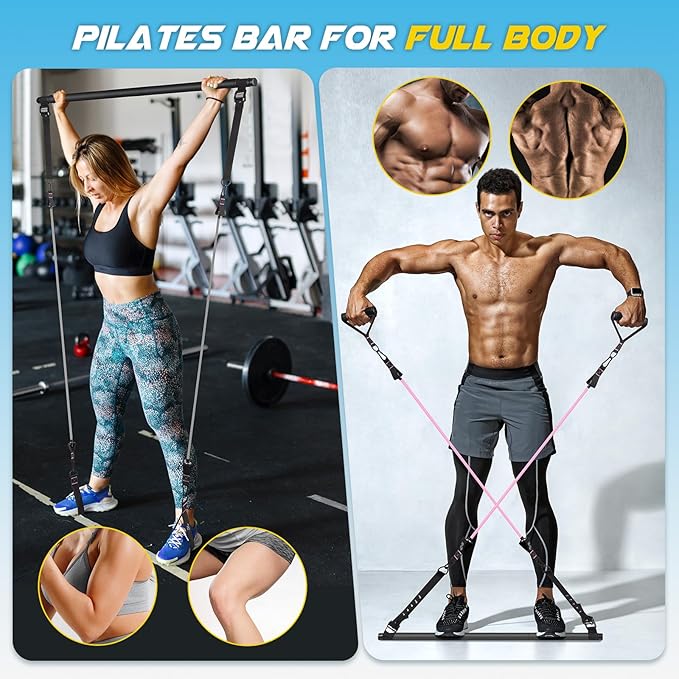 - [Multifunctional Pilates Bar Kit]: Pilates bar set with full accessory upgrades can be used for stretching, fitness and other training programs, exercising your arms, legs, buttocks, waist, neck and back. The perfect tool for building muscle and sculpting your body. 30lbs, 40lbs and 50lbs of resistance bands can be combined into 30lbs to 240lbs of resistance to meet the needs of various exercises. Door anchor, handles, and ankle straps enrich your exercise methods.