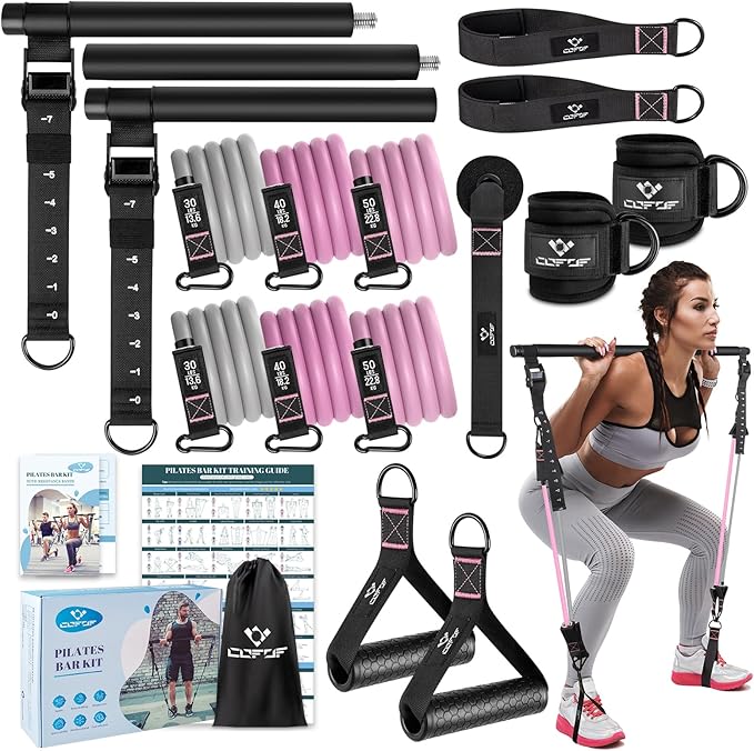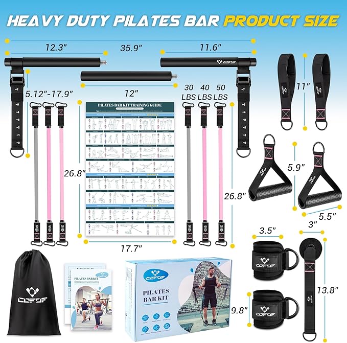 - [COFOF Pilates Resistance Bar Kit]: Our portable pilates bar kit includes 3 sections of solid metal threaded bars, 6 resistance bands can be replaced & combined, 2 handles & 2 foot straps, 1 door anchor, 2 Ankle Straps, and 1 portable bag. We provide pilates bar workout posters and detailed instruction. Any questions about quality or use method, please contact us promptly and we will get back to you within 24 hours. Your complete satisfaction is our ultimate goal.