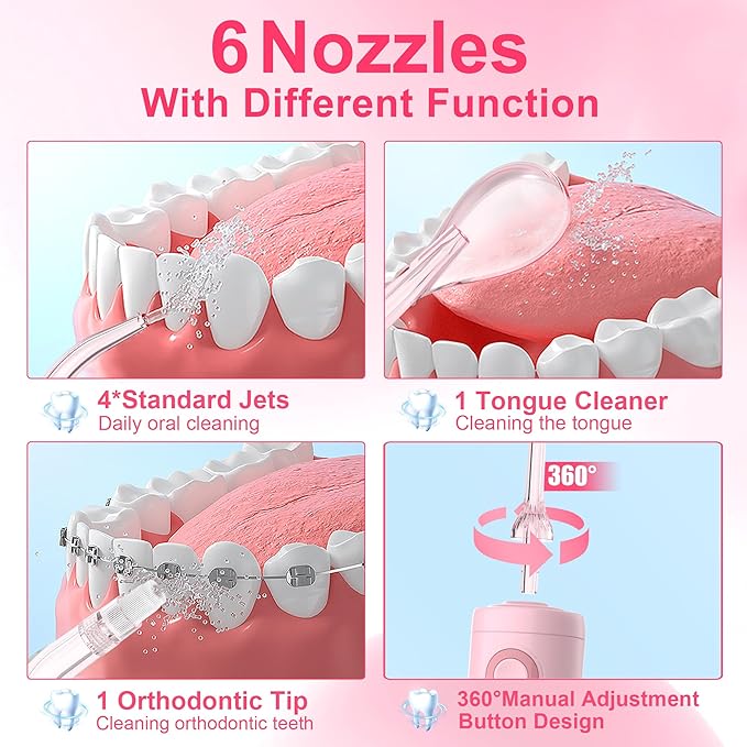 - 【Complete Family Oral Care Solution 】Our Electric Water Flosser takes oral hygiene to the next level with its set of 6 nozzles catering to diverse needs within your family. The 360° rotatable nozzle design guarantees thorough cleaning even in those hard-to-reach places. For optimal hygiene, we recommend changing the nozzle every three months.