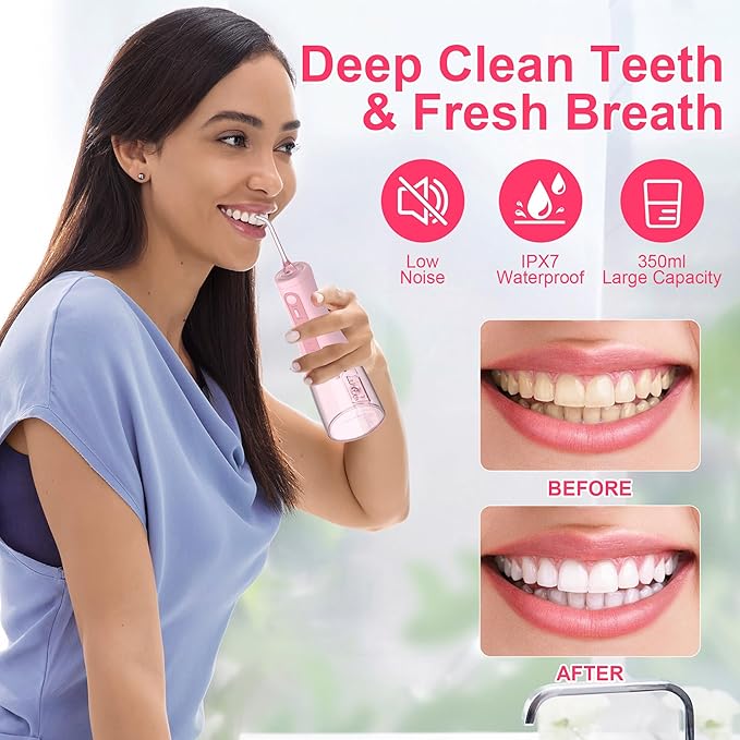- 【Precision Cleaning for Optimal Results】Our Water Flosser for Teeth Cleaning boasts a powerful water pressure range of 20-150 PSI coupled with a unique pulsation technique. This dynamic duo removes 99.99% of food residue from every nook and cranny, especially in areas traditional brushing may miss. Perfectly suited for periodontitis and braces, it's the key to improved gum health and brighter teeth.