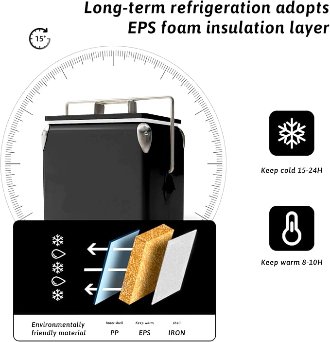 - Eco-Friendly Cooling : Environmentally-friendly cooler features premium insulation and a self-locking handle to keep your drinks and snacks cool without electricity.