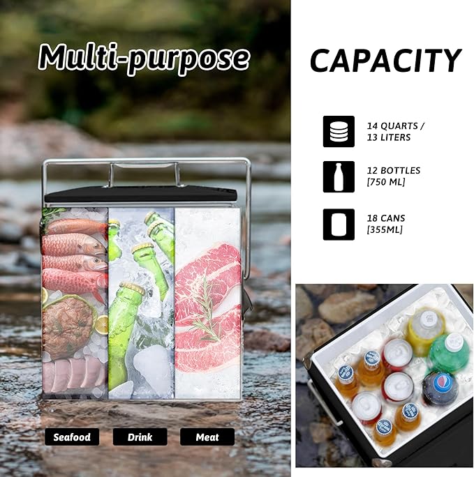 - Capacity : The compact ice chest has a generous 13 L /14 Quart capacity that holds up to 12 cans or 10 bottles of your favorite soda and plenty of ice;fill with pre-chilled items and ice for maximum cooling.