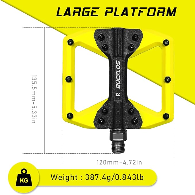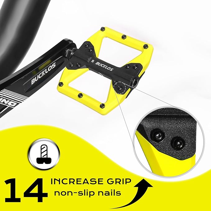 - 【Grippy & Large Platform】Bucklos flat pedals has 14 anti slip nails on each side, extra wide pedal (5.9*4.7 inch ) and fully covers the shoes, providing excellent grips and keeping your feet in the right position