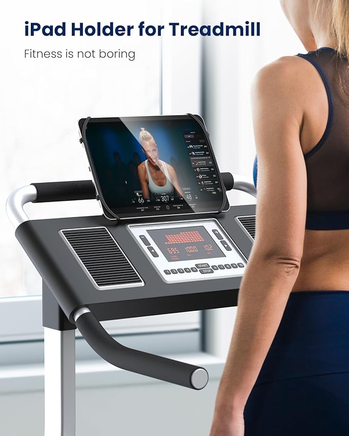 - 【Stable Structure】: Treadmill tablet holder is made of TPE+PA+Fibre, sturdy and durable. iPad clamp built-in silicone pads to add greater grip Can firmly grasp the pole, no need to worry about shaking and falling during use, ensuring maximum durability and stability.