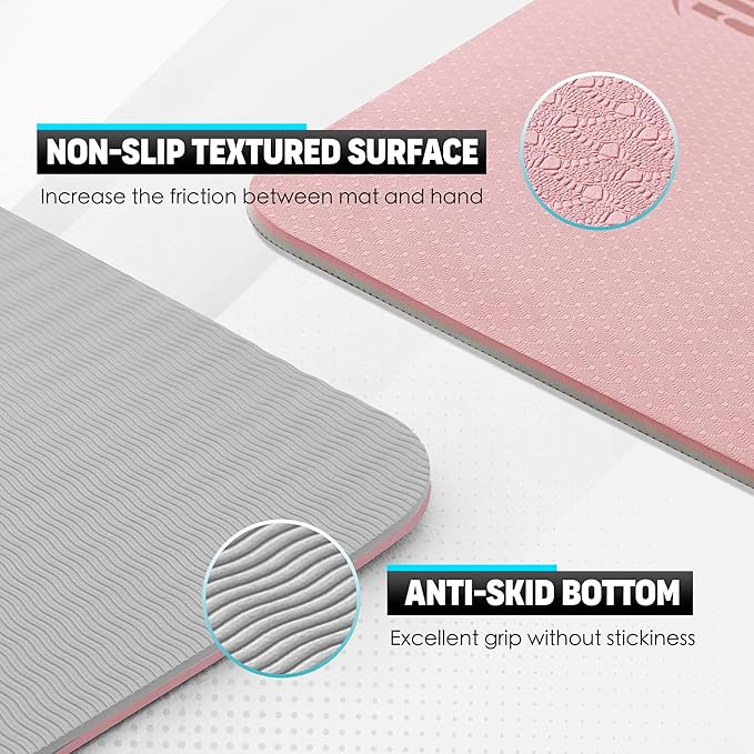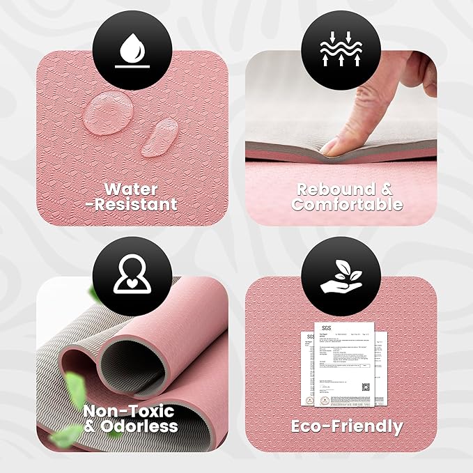 - Upgraded TPE Material: Crafted from premium TPE material, this big home gym mat is free from phthalates and has no unpleasant smell. Compared to NBR and PVC mat, TPE has a nice density. It provides ample cushioning without excessive sinking, aiding in the maintenance of balance during your practice.