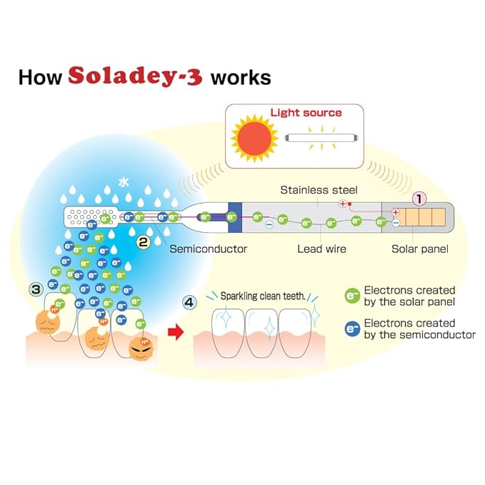 - Dual power of semiconductor (titanium dioxide) and solar technology cuts away plaque. Soladey-3 ionic toothbrush effectively removes plaque by emitting of electrons.