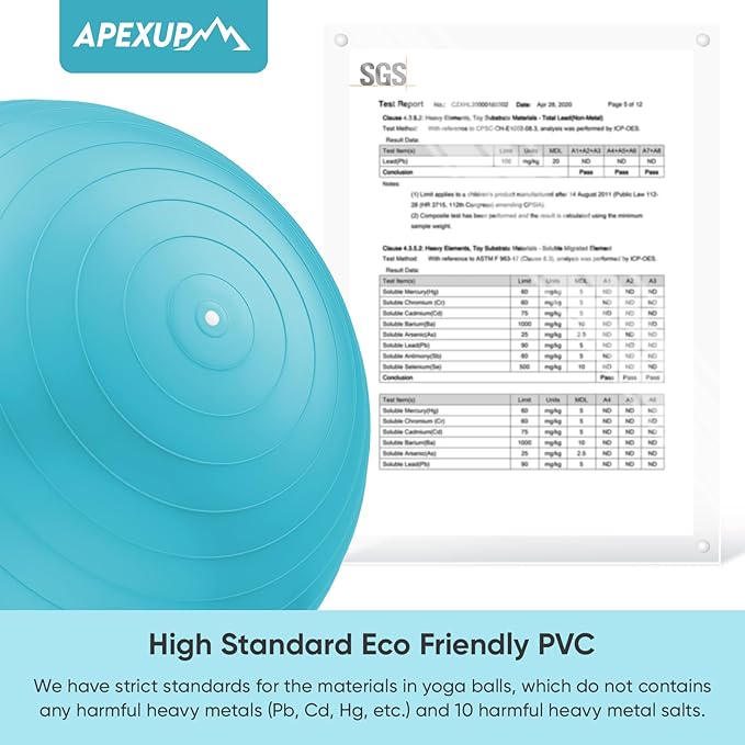 - [SAFE & ANTI BURST] APEXUP Exercise ball is made of high-quality, eco-friendly PVC material, which meets stringent safety standards. It's non-toxic, odorless, and free from harmful heavy metals. With an anti-burst honeycomb structure, it ensures durability and safety during your workouts.