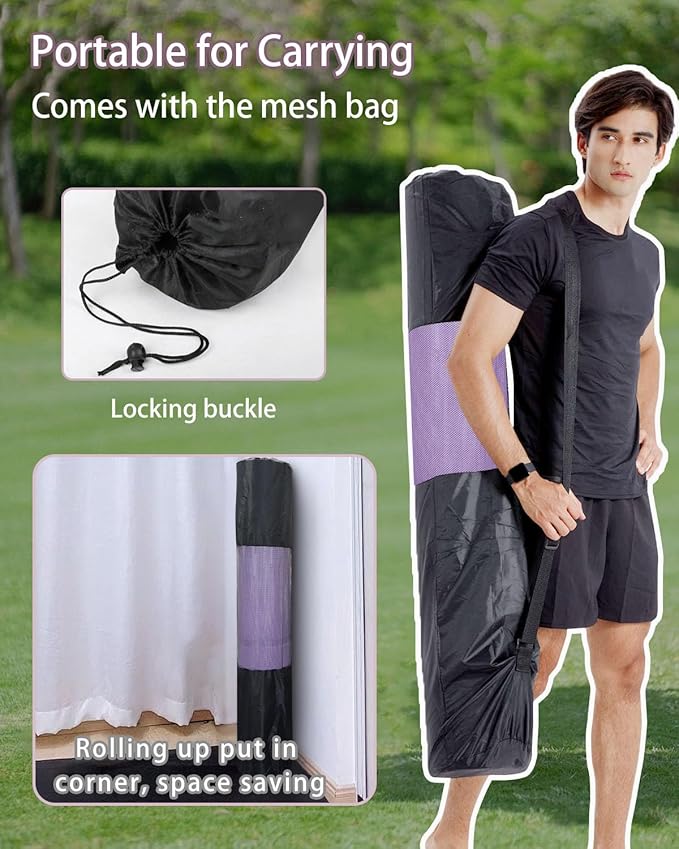 - Easy to Clean and Store: Waterproof design, easy to clean, suit for both indoor and outdoor activities. Comes with a meshed carry bag, 2 elastic band straps(inside of the rolled mat), easy to roll up and store.