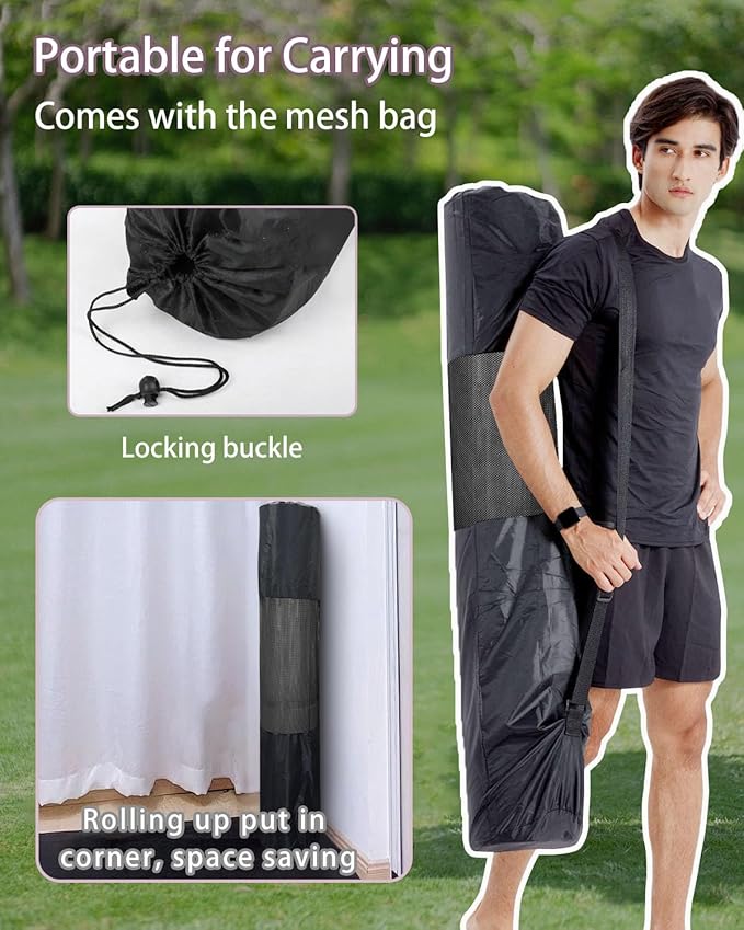 - Easy to Clean and Store: Waterproof design, easy to clean, suit for both indoor and outdoor activities. Comes with a meshed carry bag, 2 elastic band straps(inside of the rolled mat), easy to roll up and store.