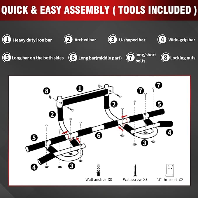 - EASY INSTALLATION WITH ALL NECESSARY TOOLS - This wide pull up bar requires a little installation. All the screws, allen wrench, locking nuts and other parts are included in the tool bag. This versatile pull-up bar is easy to hang on the door head jamb. If the door head jamb is too narrow, this hanging bar can also be fixed with the included J-racket