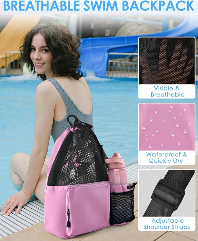 - Durability: Mesh swim backpack is crafted with sturdy fabric and reinforced stitching, which can withstand daily wear and tear. Especially, these swim bags are also machine washable. Ideal for swimming, biking, camping, hiking, pool, beach, gym, sports, etc