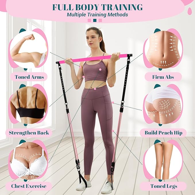 - [Multifunctional Pilates Bar Kit]: Upgraded pilates bar set can be used for yoga, pilates, stretching, fitness and other training programs, exercising your arms, legs, buttocks, waist, neck and back. As long as you use it to do different movements, you can shape and maintain a perfect figure. 20lbs, 25lbs and 30lbs of resistance bands can be combined into 20lbs to 150lbs of resistance to meet the needs of various exercises. Door anchor, handles, and ankle straps enrich your exercise methods.