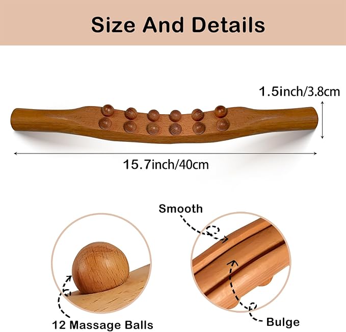 - MASSAGE STICK: Lymphatic drainage massage stick 15.7 inches long, 12 trigger point balls on massage stick, which are smooth and durable. Guasha wood stick is designed for physical therapy, gets rid of knots for myofascial release & trigger point therapy, help relax muscles after exercise, reduce neuralgia, eliminate fatigue, clear the meridians and improve blood circulation, and shape a perfect body.