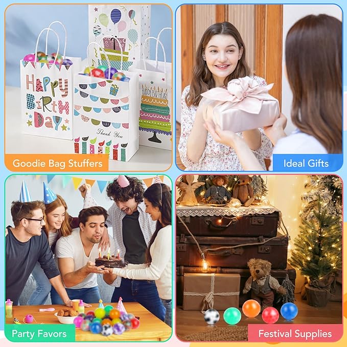 - 【PARTY IDEAL GIFTS】So novelty stress ball pack,which are packed in an exquisite box,each with an individual wrapped,is a big surprise for your friend.Fidget balls are perfect party supplies,carnival theme party decorations,Christmas gifts,Easter basket stuffers,Halloween gifts,Valentines day gifts birthday party.