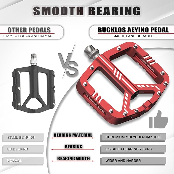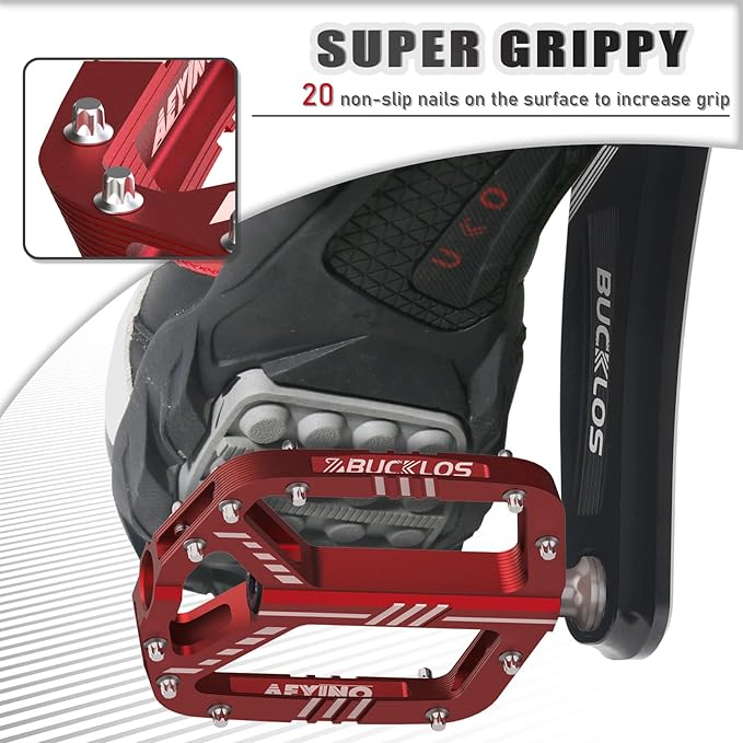 - Non-Slip:Bucklos mountain bike widen flat pedals with double-concave platform,making it easy to find the right position for your feet.AEYINO pedals provide unrivalled grip and stability -10 anti slip nails on each side, keeping your feet in place even on technically demanding or rough sections of trail