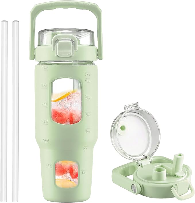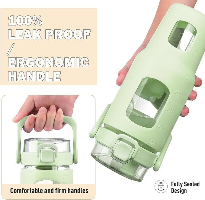 - UNIQUE DESIGN-This glass water bottle features a rotating grip handle and thick silicone sleeve, providing added protection and a secure grip. Crafted from thick borosilicate glass, it's ideal for home, office, or gym workout use. The sport bottle enables two ways to drink water with convenient straw lid, perfect for sipping on the go.
