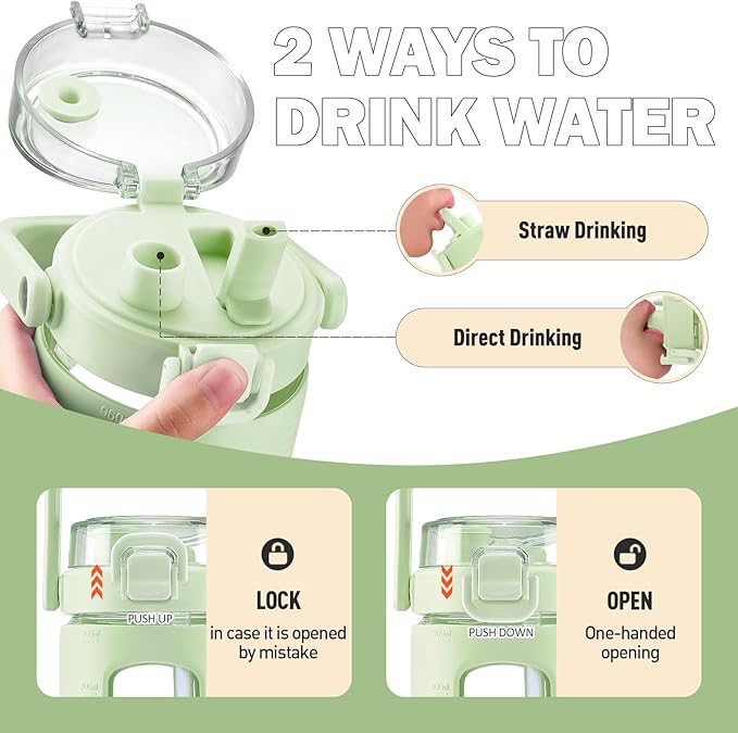 - 100% LEAKPROOF-The 32oz glass water bottle featured with pop up lid with premium safety lock, 100% leak-proof, and can be easily opened with one hand.The sport glass bottles equipped with a comfortable and firm handle and can be one-click lock to prevent any leak or spills by accident. Ideal for Sports and Fitness, It keeps you hydrated after your workout. A must for gym, fitness, camping, cycling, running, yoga and travel.