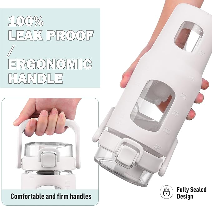 - UNIQUE DESIGN-This glass water bottle features a rotating grip handle and thick silicone sleeve, providing added protection and a secure grip. Crafted from thick borosilicate glass, it's ideal for home, office, or gym workout use. The sport bottle enables two ways to drink water with convenient straw lid, perfect for sipping on the go.