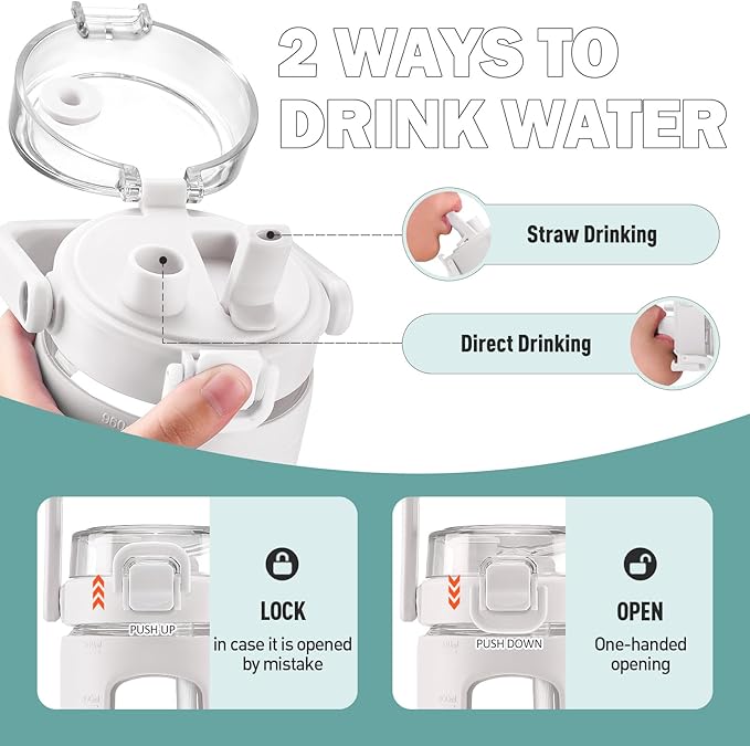 - 100% LEAKPROOF-The 32oz glass water bottle featured with pop up lid with premium safety lock, 100% leak-proof, and can be easily opened with one hand.The sport glass bottles equipped with a comfortable and firm handle and can be one-click lock to prevent any leak or spills by accident. Ideal for Sports and Fitness, It keeps you hydrated after your workout. A must for gym, fitness, camping, cycling, running, yoga and travel.