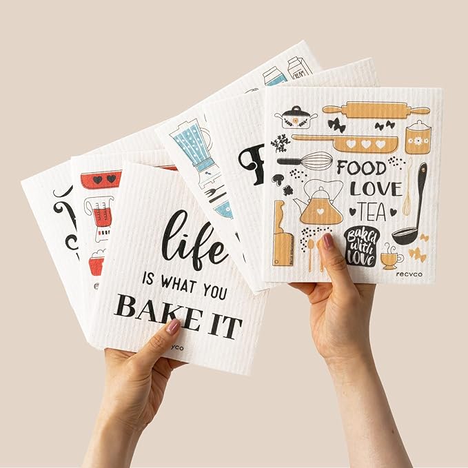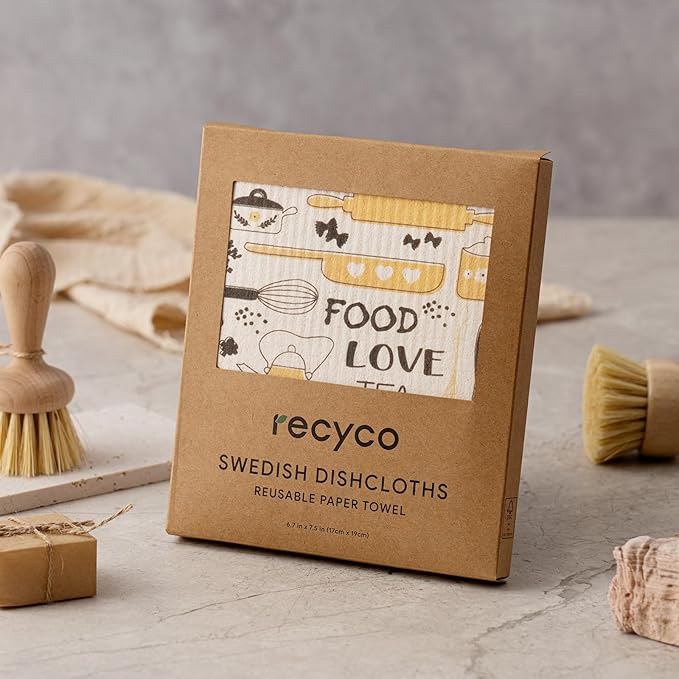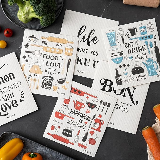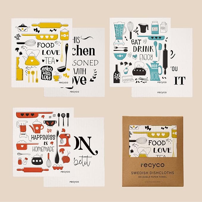 RECYCO Swedish Dishcloths for Kitchen | 6 Pack Kitchens Love Washable Dish Rags | Cellulose Reusable Cleaning Paper Towels | Absorbent Counter Dish Cloth Sponge Kitchen Wipes, 8" L x 7" W