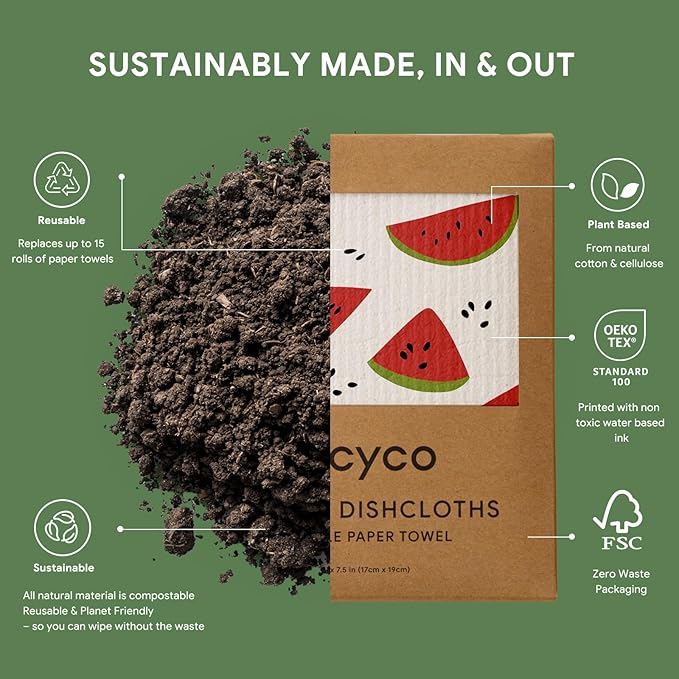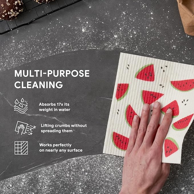 - Plant-Based & Biodegradable: Our 8” x 7” swedish dishcloth is 100% biodegradable, vegan, and free from harmful chemicals. Made from FSC certified cellulose and cotton fibers, it can decompose naturally in just 6-8 weeks, making it your best conscious choice for a greener lifestyle.