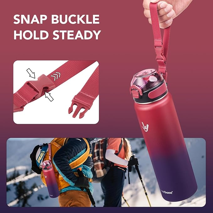 - Easy Travel: With its generous 32 oz capacity, the water bottle with snap buckle is perfect for all your outdoor adventures, such as hiking, camping, and sporting events. Stay hydrated and enjoy your journey hassle-free with this versatile companion.
