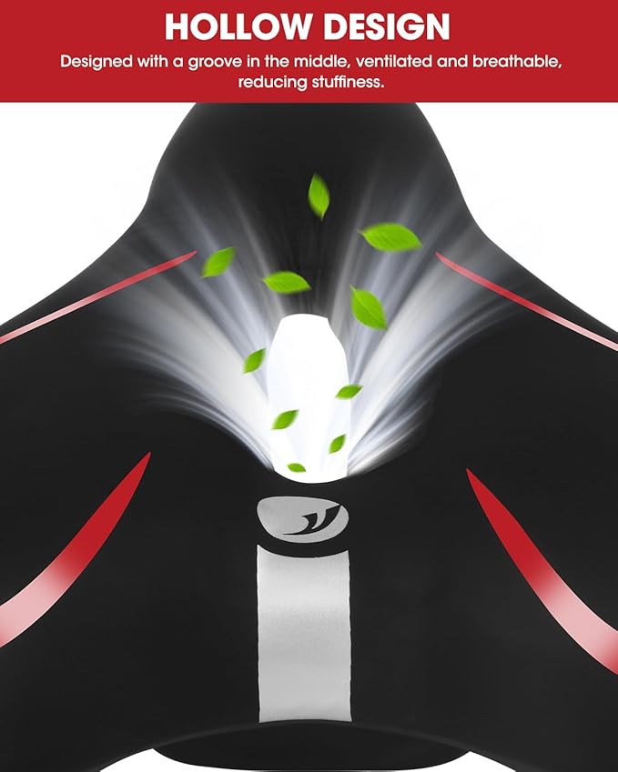 - 【Breathable Hollow Design】This bicycle saddle was designed with a groove in the middle, which can speed up the airflow, ventilated and breathable to reduce muggy feelings.